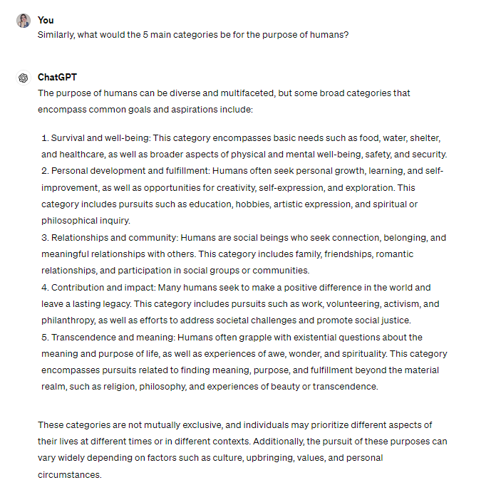 It broke the answer down to Survival and well-being, Personal development and fulfilment, Relationships and community, Contribution and impact, and Transcendence and meaning: